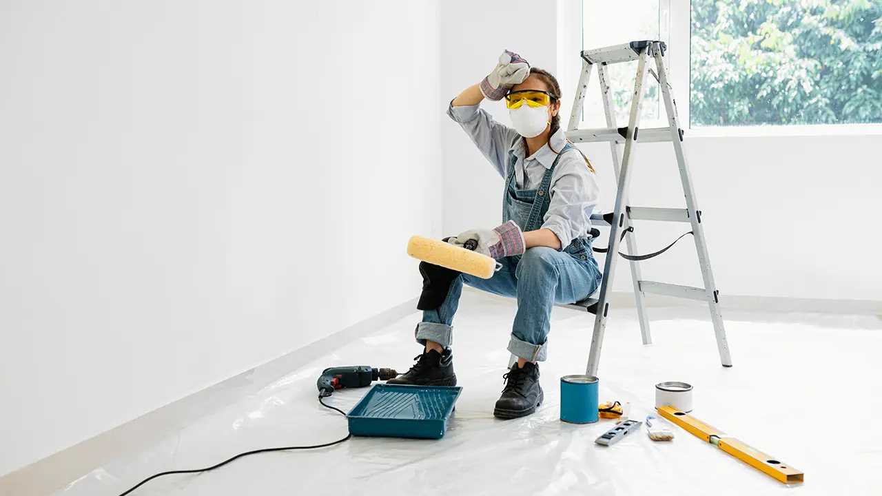 A painter taking a break during a home renovation, illustrating the thoroughness of our preparation and finishing processes.